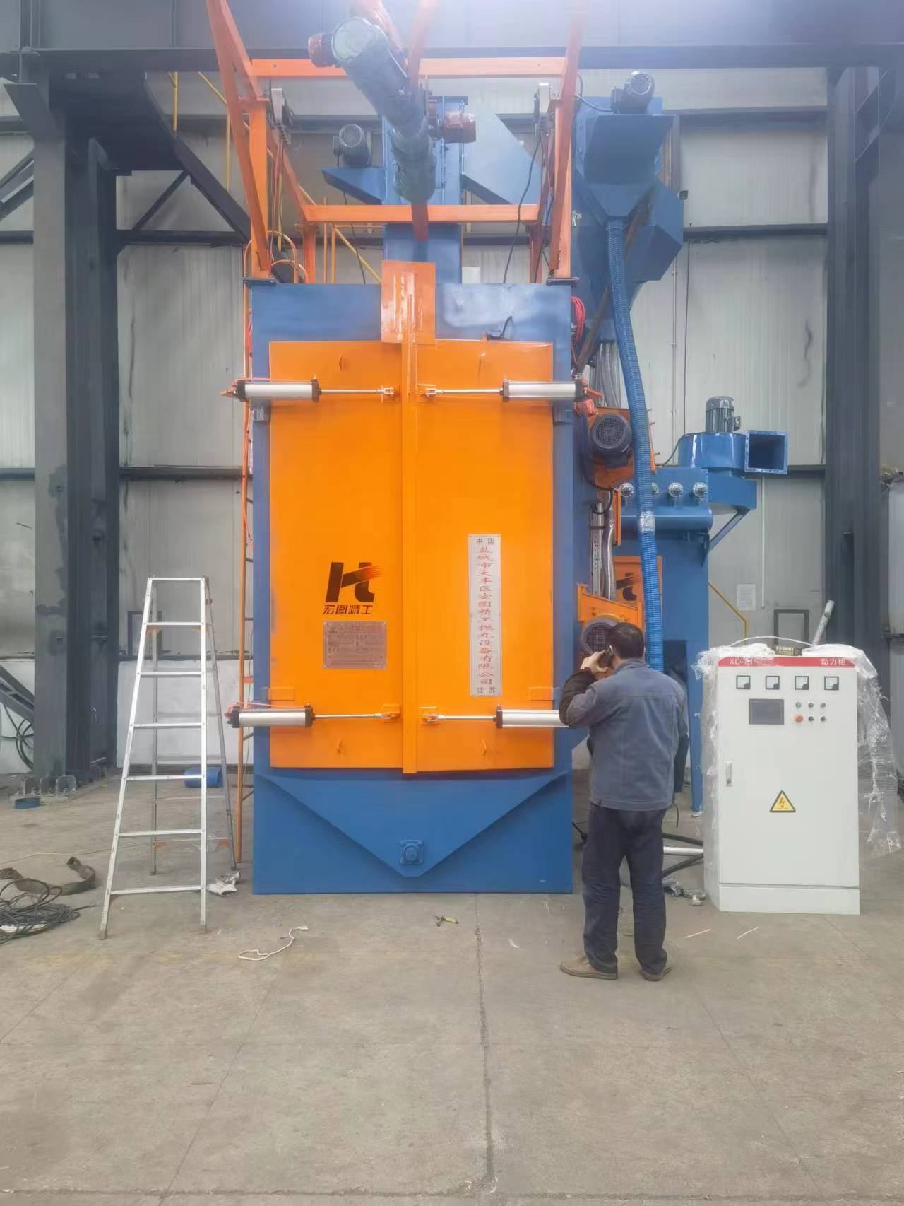 上图是上海大众配套汽车保险杠支架客户采购我公司Q3740-4吊钩式抛丸机现场安装!